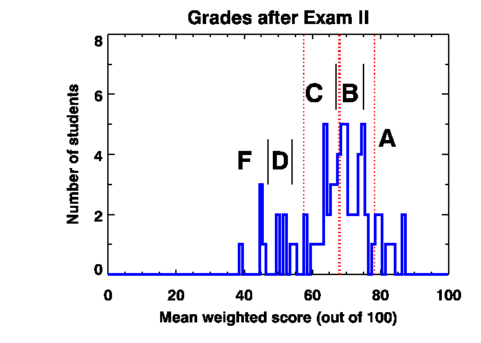The grades below include all of your grades, despite the fact that one exam and a small number of quizzes and exercises will later be dropped. The relative numbers of As, Bs, and Cs is a reasonable reflection of how I think these grades will be distributed at the end of the semester. It is my hope that there will be no Ds or Fs.
